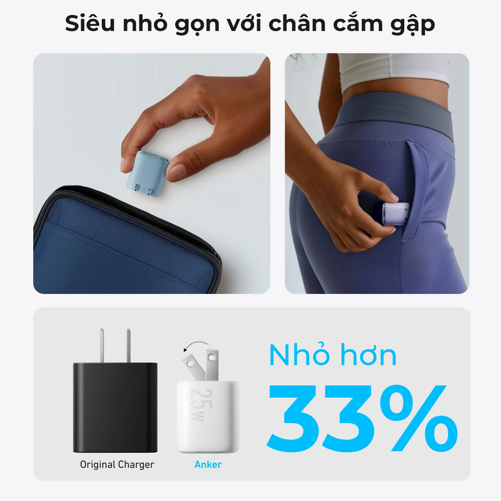 Thiết kế tinh tế, nhỏ hơn khoảng 33% so với sạc thông thường, đi kèm chân cắm gập tiện lợi cho cất giữ và mang theo.