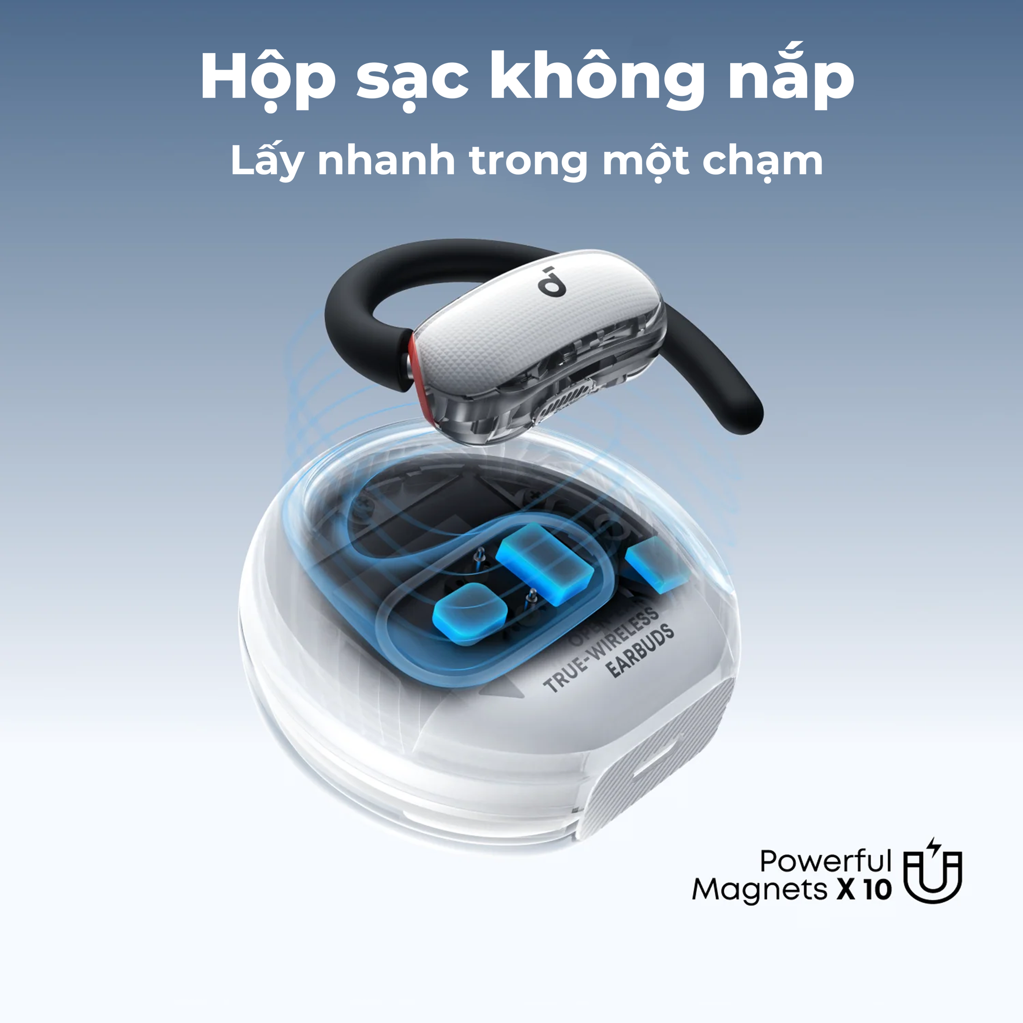 Thiết kế hộp sạc trong suốt, không cần nắp đậy – chỉ cần nhấc nhẹ là có thể sử dụng ngay. 10 nam châm siêu mạnh giúp cố định tai nghe chắc chắn, tránh rơi rớt hay thất lạc, đồng thời tạo cảm giác hiện đại và tiện lợi tối đa trong từng thao tác.