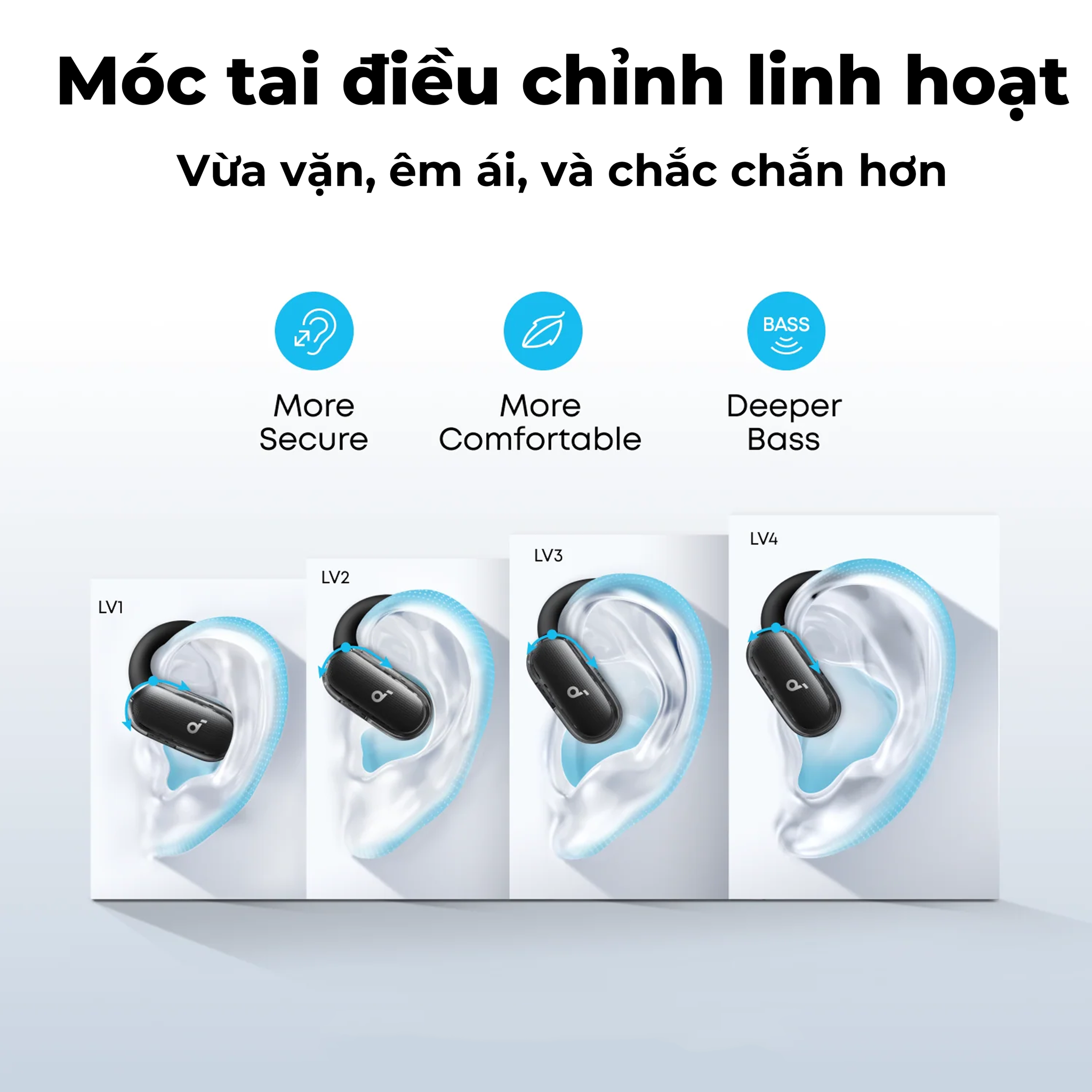 Cấu trúc móc tai 4 cấp độ điều chỉnh linh hoạt được Soundcore nghiên cứu để phù hợp với hơn 99% hình dạng tai người dùng, cho cảm giác đeo ổn định và tự nhiên.