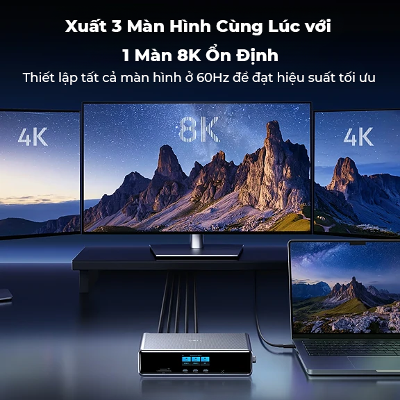 Hỗ trợ xuất đồng thời 3 màn hình với 1 màn hình đạt độ phân giải 8K ổn định và 2 màn hình 4K. Công nghệ DisplayLink cho phép mở rộng không gian làm việc mượt mà qua USB-C 10Gbps – lý tưởng cho setup văn phòng và đa nhiệm chuyên nghiệp.