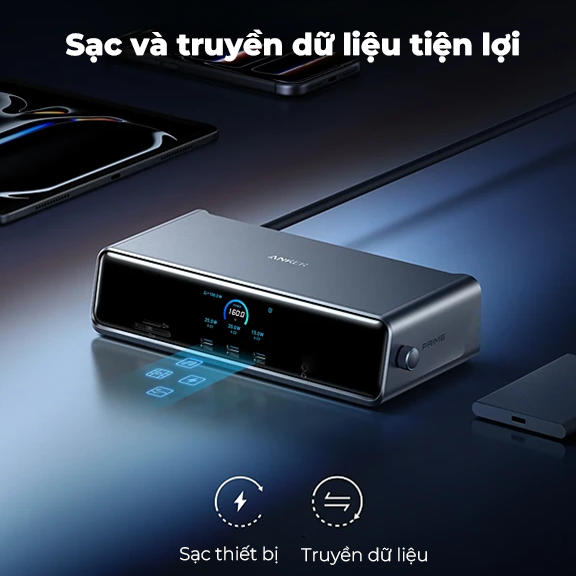 Trạm sạc cao cấp hỗ trợ sạc nhanh USB-C với công suất lên đến 140W cho laptop, tổng công suất 160W. Trang bị công nghệ PowerIQ thông minh, sạc hiệu quả nhiều thiết bị cùng lúc – lý tưởng cho setup làm việc chuyên nghiệp.