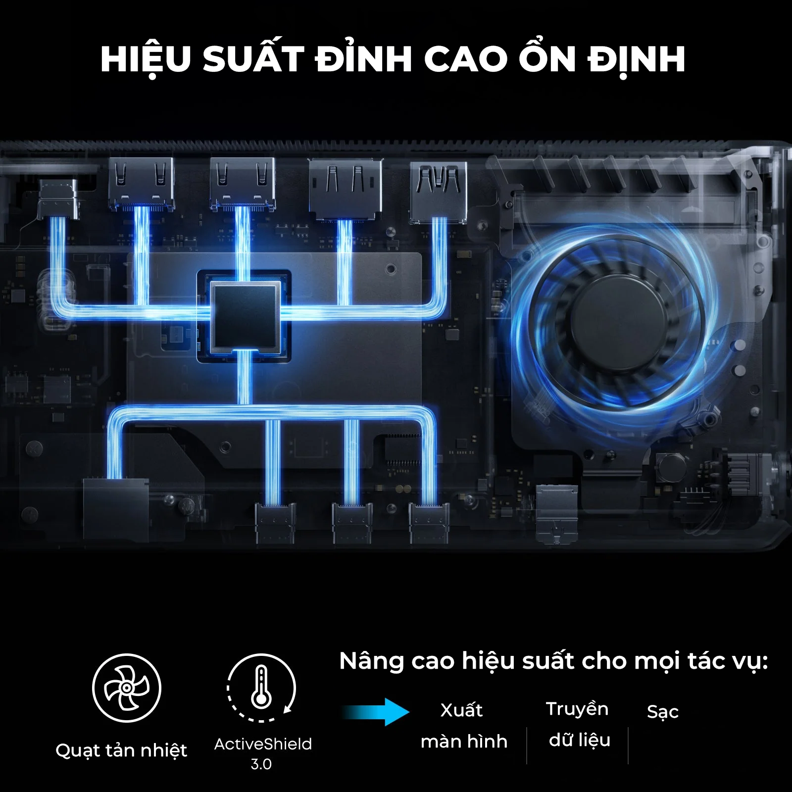 Trang bị quạt tản nhiệt tích hợp và công nghệ ActiveShield 3.0, Anker Prime Docking Station đảm bảo hoạt động bền bỉ kể cả khi sử dụng nhiều cổng cùng lúc. Hiệu năng được tối ưu cho mọi tác vụ: xuất hình, truyền dữ liệu và sạc thiết bị.